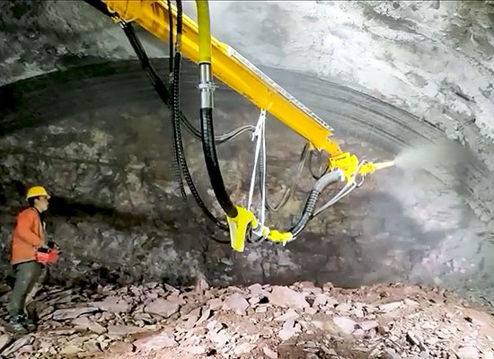 隧道施工濕噴混凝土設備主要有隧道濕噴機械手和普通濕噴機兩種。隧道濕噴機械手與普通濕噴機相比,具有機動靈活自由、作業時間短、工作效率高、噴射量大、回彈小、作業勞動強度低、安全,工序銜接緊湊等優勢。